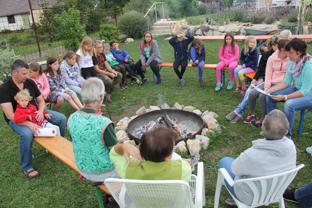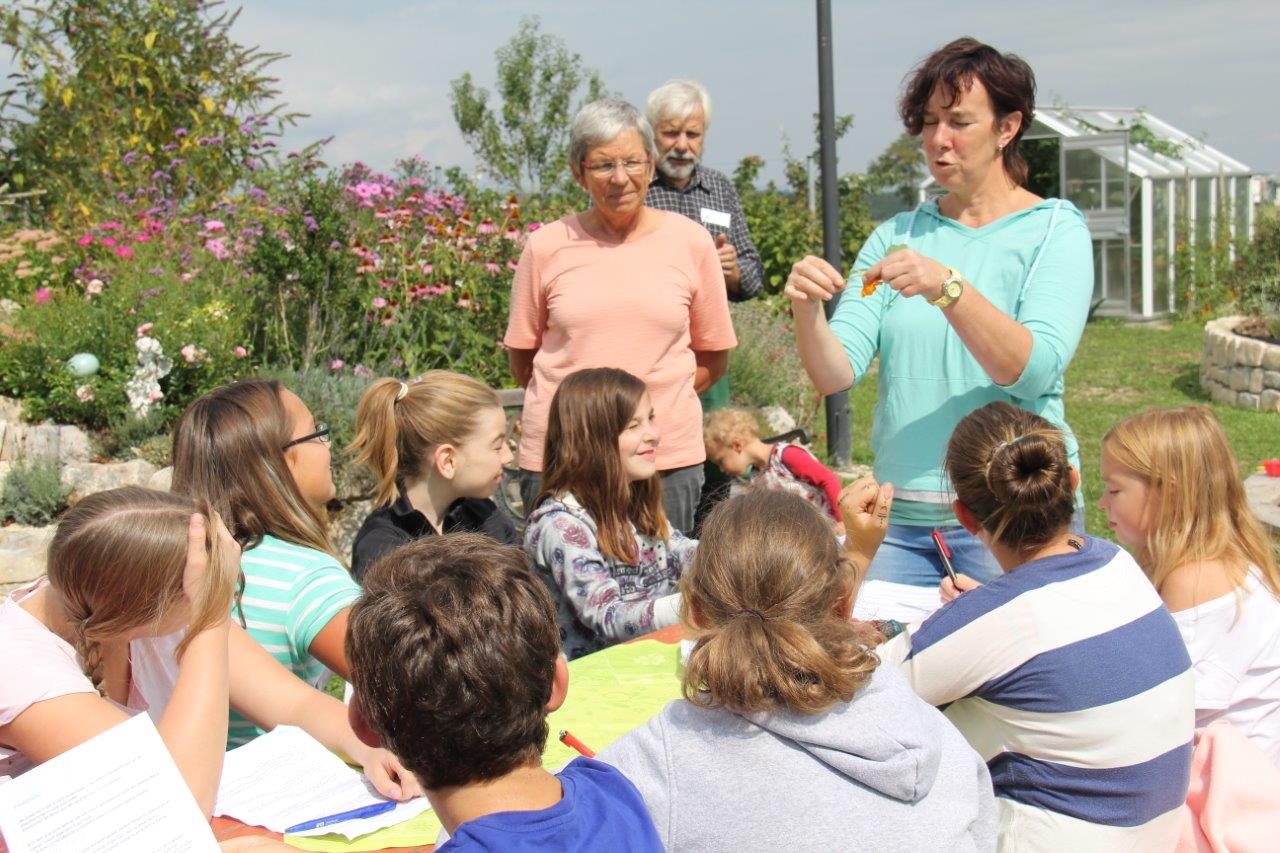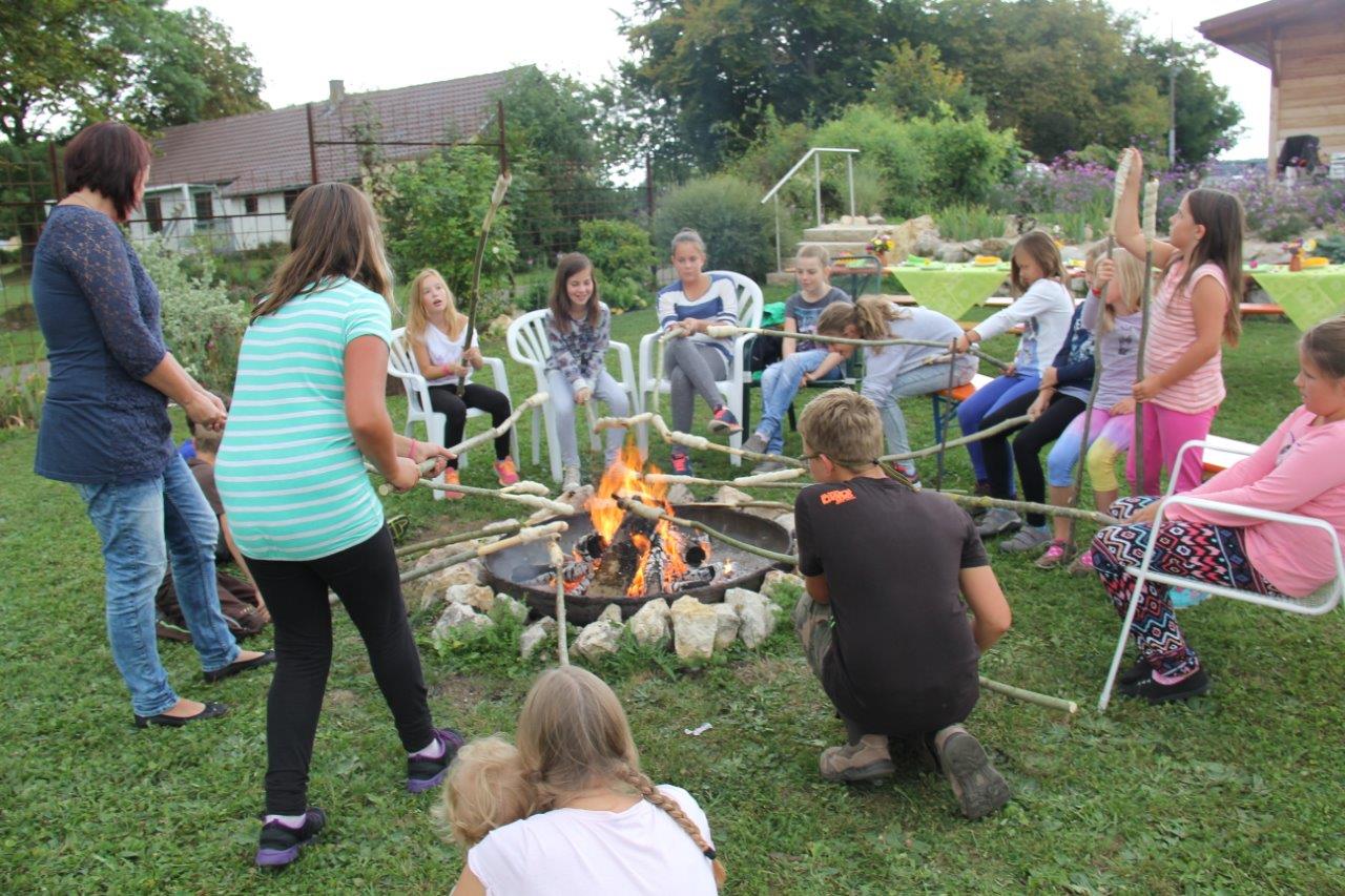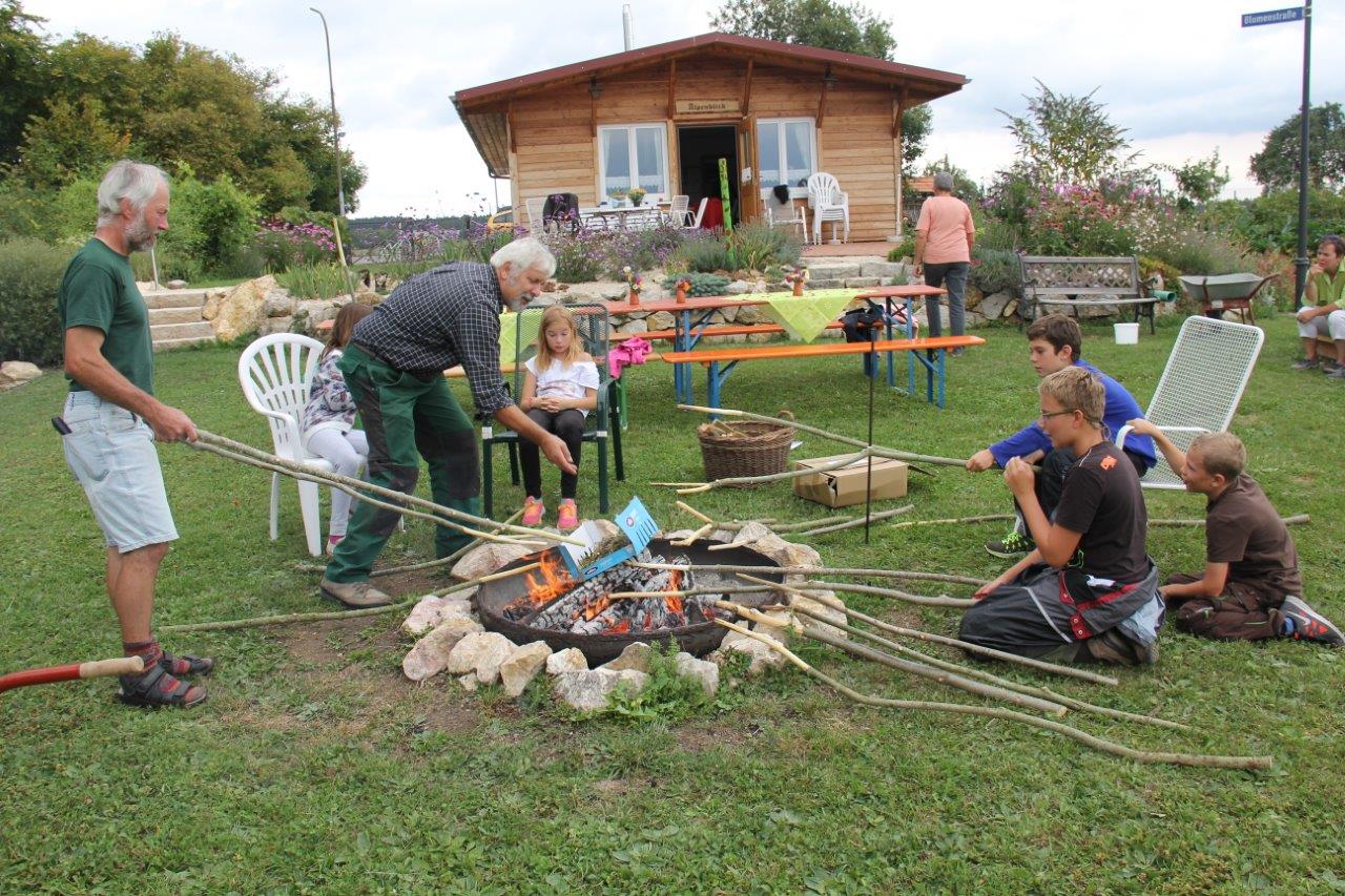 „Alles rund um die Kräuter“ hat das Motto beim Kinderferienprogramm des Obst- und Gartenbau-Vereins Neuhausen und des Gesangvereins „Harmonie“ gelautet. Kräuterfachfrau Barbara Dangel schickte die Kinder durch das Gelände „Alpenblick“, um bei einem Kräuterrätsel elf verschiedene Kräuter zu erkennen und zu finden. Mit Unterstützung des Betreuerteams fanden die kleinen Naturliebhaber unbekannte Kräuter wie Borretsch, Salbei, Bohnenkraut oder Basilikum. Mit diesen Kräutern bereiteten die Kinder Kräuterquark in verschiedenen Variationen zu. Nachdem die Kinder den Tisch mit Blumen und Kräutern dekoriert hatten, wurde noch Kräuterstockbrot am Lagerfeuer gebacken und frische Pellkartoffeln gekocht.